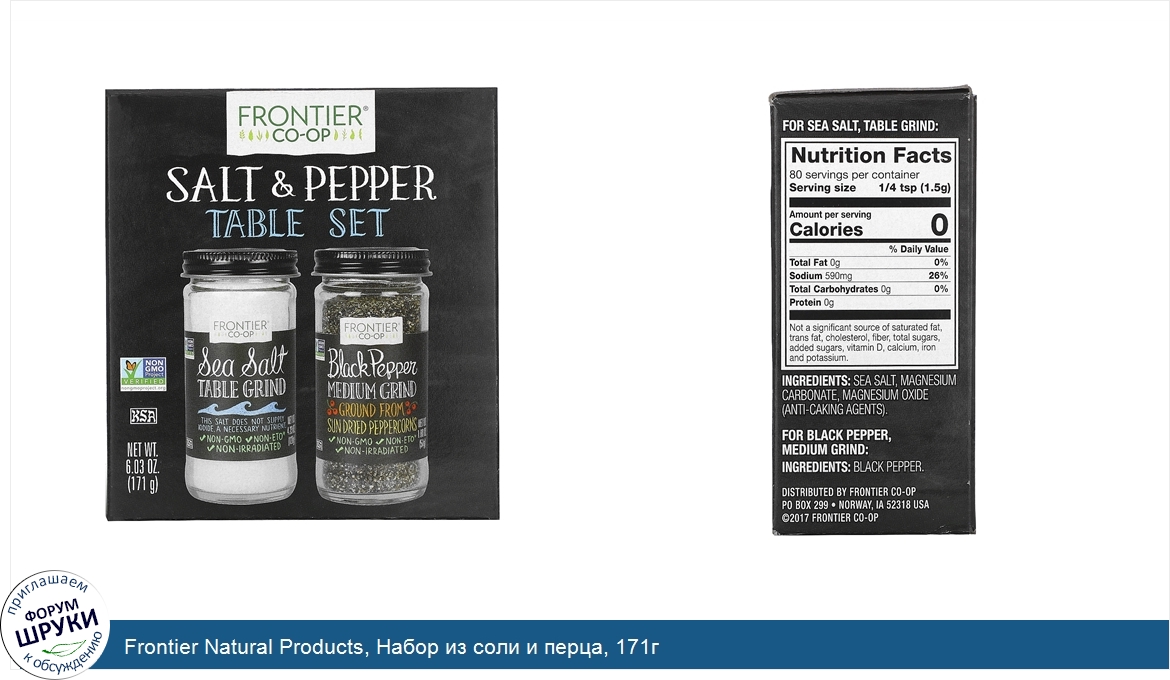 [DESCRIPT]Non-GMO Verified. KSA Kosher. We're a member-owned Co-op responsible to people and planet. You can feel good about the superior flavor of Frontier Co-op seasonings. We look to growers who share our commitment to quality, sustainability, and ethical trade. Salt Pepper Table Set Includes:. Medium Grind Black Pepper - Net Wt. 1.80 oz (51 g). Table Grind Sea Salt - Net Wt. 4.23 oz (120 g). Sea Salt Table Grind. Non GMO Project. Verified. Non-ETO. Non-Irradiated. This salt does not supply iodide. A necessary nutrient. It's no secret that salt from the sea is a culinary delight. Frontiers Tables Grind is perfectly sized for use as a finishing salt and in all of your cooking and baking needs. Black Pepper Medium Grind. Non GMO Project Verified. KSA Kosher. Ground From Sun Dried Peppercorns. Non-ETO*. Non-Irradiated. These peppery-hot grains are just large enough to retain a full, bold flavor and punch. Make any savory food for interesting and flavorful with a sprinkle of black pepper. *ETO (Ethylene oxide) is a sterilization chemical commonly used in the spice industry, but never by Frontier Co-op.[/DESCRIPT]... (описание дополняется)