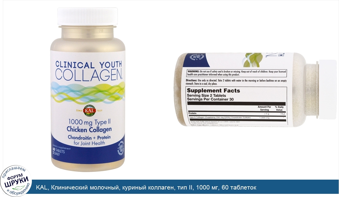 [DESCRIPT]Since 1932. Innovative Quality. Chondroitin + Protein for Joint Health. Dietary Supplement. 60 Tablets - 2 Daily. Activ Tab - 30 Minute - Disintegration . Discussion: KAL Clinical Youth Collage provides 1000 mg Type II Collagen per serving. Type II Collagen is the principal structural protein in cartilage. It is intended to provide nutritive support for healthy joints and mobility. ActivTab technology guarantees tablet disintegration within 30 minutes according to USP standards.[/DESCRIPT]... (описание дополняется)