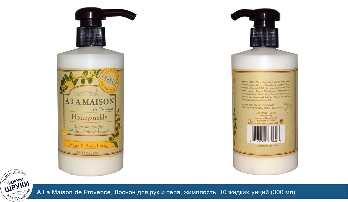 Друзья, если у вас есть отзыв/дополнение/комментарий/вопрос относительно A La Maison de Provence, Лосьон для рук и тела, жимолость, 10 жидких унций (300 мл) - напишите его ответом в эту тему (это будет полезно всему сообществу в целом и вам в отдельности).