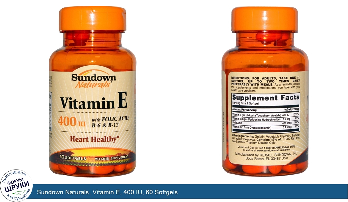 Друзья, если у вас есть отзыв/дополнение/комментарий/вопрос относительно Sundown Naturals, Vitamin E, 400 IU, 60 Softgels - напишите его ответом в эту тему (это будет полезно всему сообществу в целом и вам в отдельности).