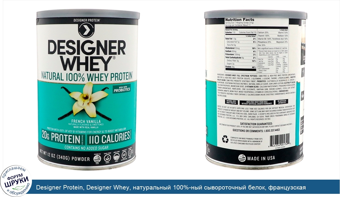 [DESCRIPT]Теперь с пробиотиками. Естественные вкус и сладость. Изготовлен из настоящей ванили. Протеин со 100% ключевых витаминов группы B для повышения энергичности организма и ускорения метаболизма. 20 г протеина на порцию. 110 калорий на порцию. Без добавления сахара. Сыворотка без ГМО. Сыворотка без rBGH. Подтверждено отсутствие глютена. Сертифицированный кошерный продукт. Натуральный 100% сывороточный белок. Сыворотка без рекомбинантного бычьего гормона роста из молока коров, не получавших искусственных гормонов роста. Без искусственных антибиотиков. Лучший продукт с протеином с 1993 года. - Натуральный протеин с дополнительными питательными свойствами*. Компания Designer Protein является одним из лидеров индустрии производства высококачественных продуктов питания. Мы производим широкий набор протеинов и суперпродуктов для фитнеса, повышения эффективности тренировок, контроля веса и укрепления здоровья. Продукты с высоким содержанием протеина. 100% сывороточный протеин с полным спектром пептидов, а также пищевых энзимов из овощей для поддержки усвоения протеина, с витаминами группы В для превращения протеина в энергию, с кальцием, витамином D, фосфором, магнием, цинком, пробиотиками и электролитами для восстановления организма после тренировок. Содержит натуральную пребиотическую растительную клетчатку, которая продлит чувство сытости, и вы не будете чувствовать голод многие часы. Из натуральных продуктов. Натуральная сыворотка без ГМО из молока коров со Среднего Запада, выращенных без использования искусственных гормонов роста и антибиотиков. Профиль аминокислот (на порцию в 100 г) . Аланин. 5000 мг. Аргинин. 2667 мг. Аспарагиновая кислота. 9056 мг. Цистеин. 2000 мг. Глутаминовая кислота. 17011 мг. Глицин. 1600 мг. Гистидин. 1683 мг. Изолейцин. 7089 мг. Лейцин. 11011 мг. Лизин. 9667 мг. Метионин. 3100 мг. Фенилаланин. 2500 мг. Пролин. 3500 мг. Серин. 3900 мг. Треонин. 8300 мг. Триптофан. 2000 мг. Тирозин. 3000 мг. Валин. 6916 мг.[/DESCRIPT]... (описание дополняется)