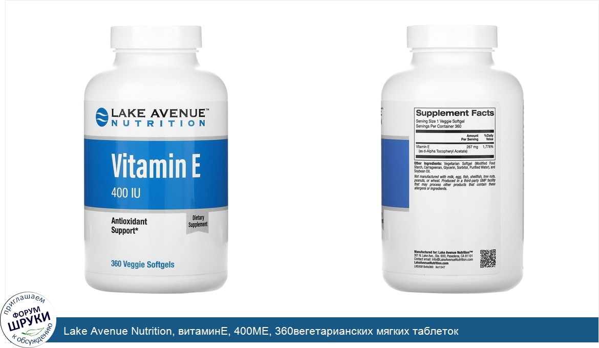 . Витамин E. от. Lake Avenue Nutrition. , 400 МЕ. Антиоксидантная защита*. Без ГМО. Производится на предприятии, имеющем регистрацию GMP. Lake Avenue Nutrition. предлагает продукты высокого качества по доступным ...