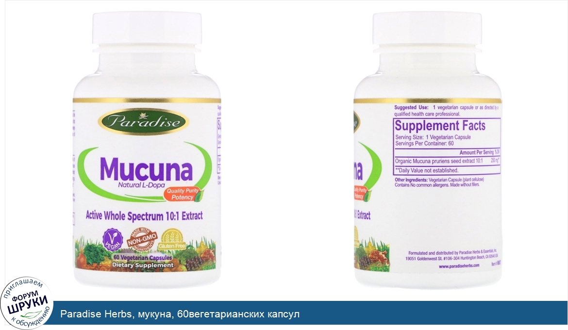 Друзья, если у вас есть отзыв/дополнение/комментарий/вопрос относительно Paradise Herbs, мукуна, 60вегетарианских капсул - напишите его ответом в эту тему (это будет полезно всему сообществу в целом и вам в отдельности).