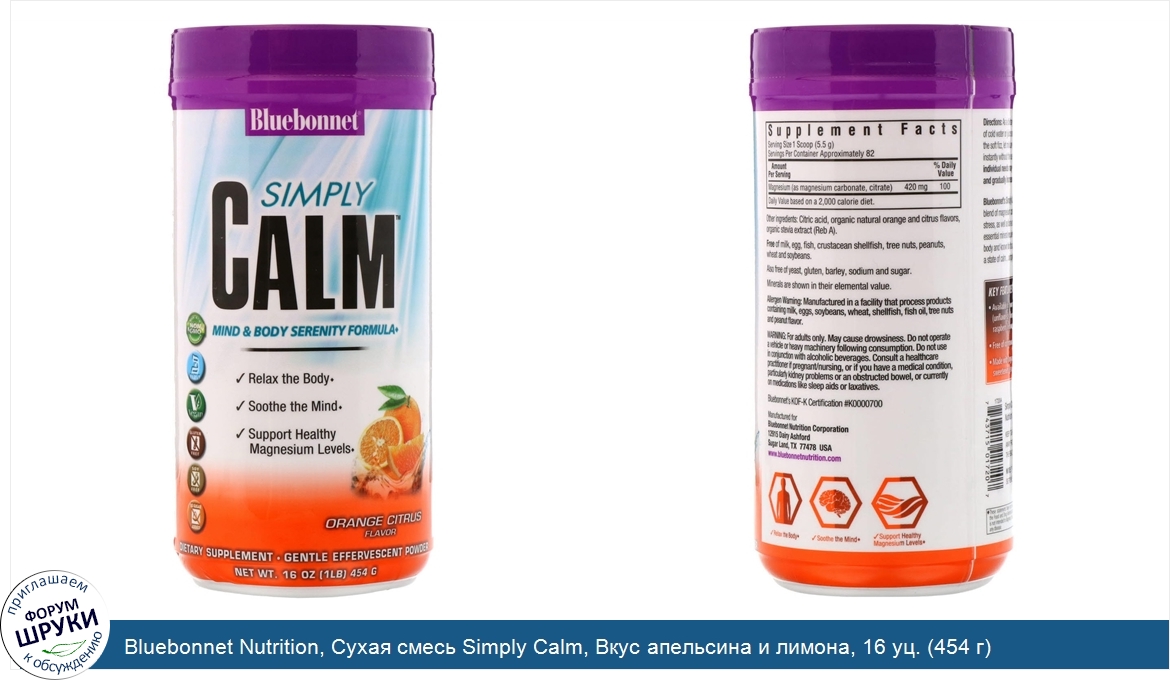 [DESCRIPT]Mind Body Serenity Formula. Made With Non GMO Ingredients. Kosher Parve. Vegan. Gluten Free. Soy Free. No Sugar Added. Relax the Body. Soothe the Mind. Support Healthy Magnesium Levels. Dietary Supplement. Gentle Effervescent Powder. Bluebonnet's Simply Calm Powder is a special, water-soluble blend of magnesium carbonate/citrate for occasional sleeplessness, stress, as well as bone and immune support. Magnesium is an essential mineral required in over 300 biochemical reactions in the body and known for its ability to help the mind and body ease into a state of calm.simply. Key Features. Free of common allergens (soy, gluten milk). Made with organic natural flavors and sweeteners (stevia).[/DESCRIPT]... (описание дополняется)