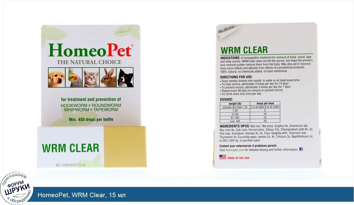 [DESCRIPT]Natural. For Treatment and Prevention of Hookworm/Roundworm/Whipworm/Tapeworm. Min. 450 Drops Per Bottle. The Natural Choice. Made in the USA. A homeopathic treatment for removal of hook, round, tape and whip worms. WRM clear does not kill the worms, but helps the animal's own immune system remove them from the body. May also aid in recovery from worm effects and detoxify from effects of conventional products. 100% natural, no chemicals added, no food withdrawal.[/DESCRIPT]... (описание дополняется)