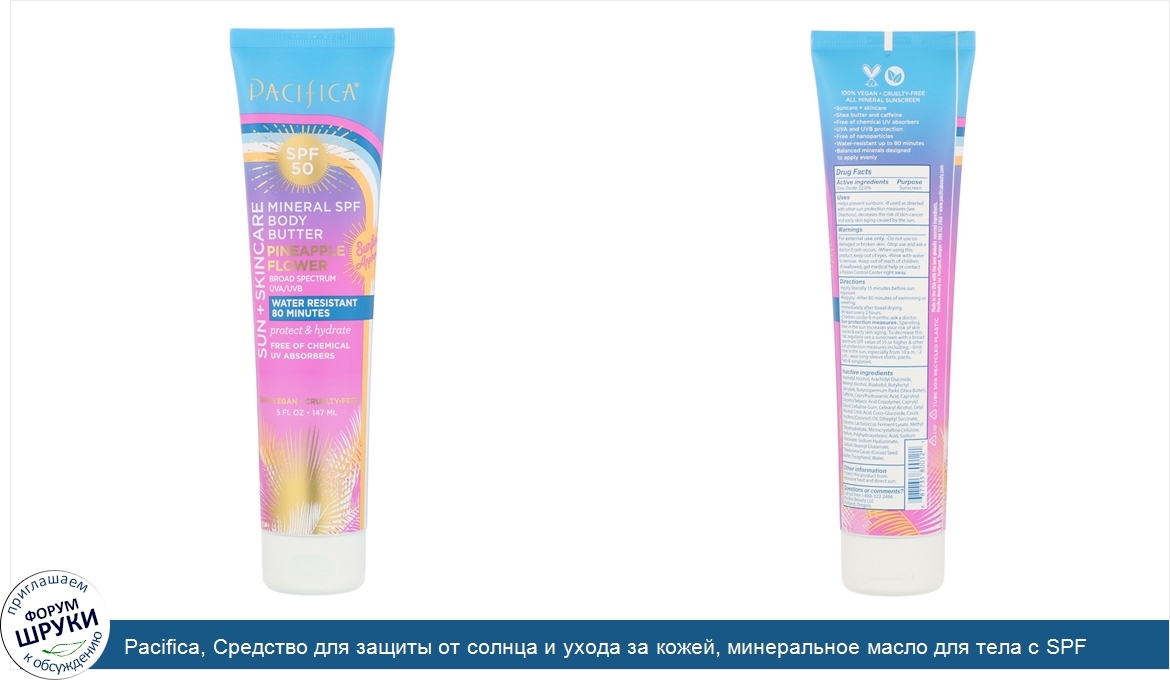 Друзья, если у вас есть отзыв/дополнение/комментарий/вопрос относительно Pacifica, Средство для защиты от солнца и ухода за кожей, минеральное масло для тела с SPF, SPF 50, цветки ананаса, 147мл (5жидк.унций) - напишите его ответом в эту тему (это будет полезно всему сообществу в целом и вам в отдельности).