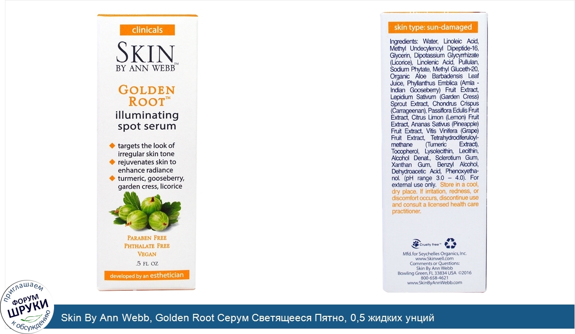Друзья, если у вас есть отзыв/дополнение/комментарий/вопрос относительно Skin By Ann Webb, Golden Root Серум Светящееся Пятно, 0,5 жидких унций - напишите его ответом в эту тему (это будет полезно всему сообществу в целом и вам в отдельности).