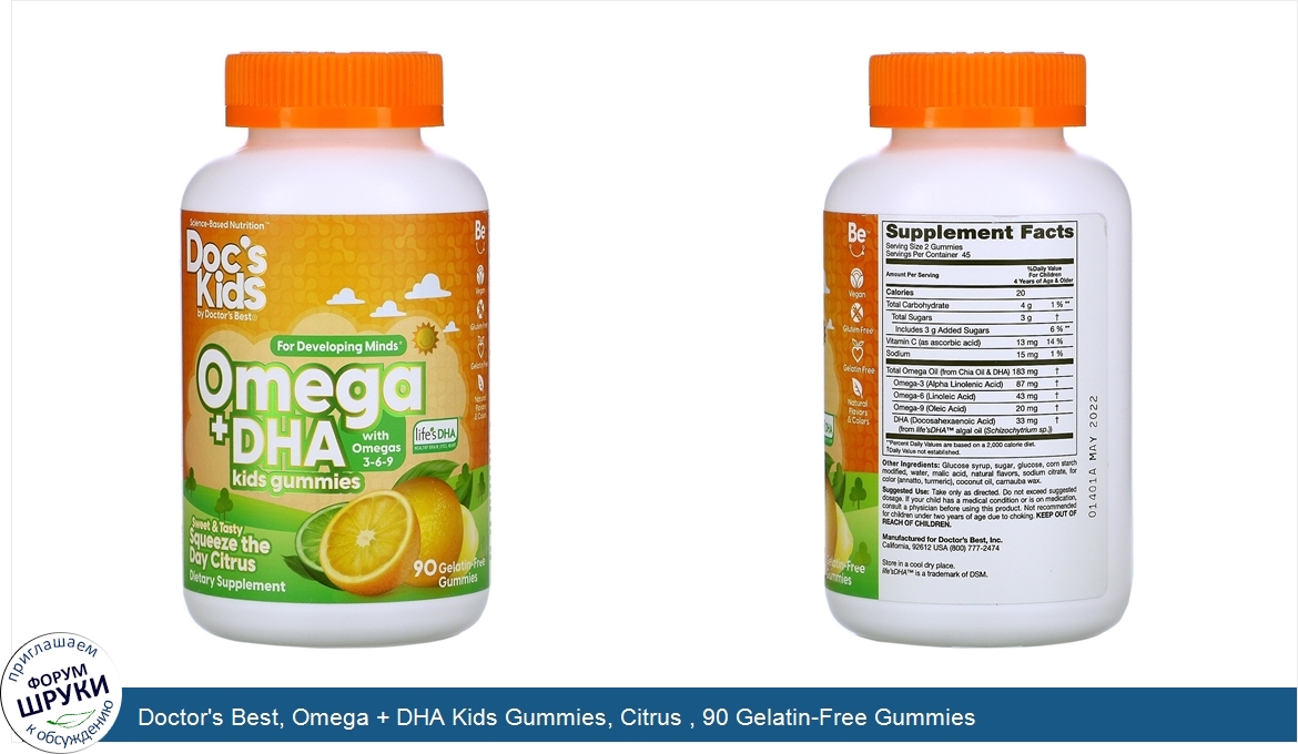 [DESCRIPT]Science-Based Nutrition™. By Doctor's Best®. For Developing Minds. With Omegas 3-6-9. Life's DHA - Healthy Brain, Eyes, Heart. Sweet Tasty. Squeeze the Day Citrus. Dietary Supplement. Be™. Vegan. Gluten Free. Gelatin Free. Natural Flavors Colors. Doc's Kids Omega + DHA Gummies. Delicious combination of Omegas 3-6-9, DHA, and vitamin C, helps support developing minds, heart, vision, immune, and joint health. This specially formulated vegan gummy is made with chia seed oil and algal oil,designed to a supplement a daily balanced intake of essential fatty-acids (Omega-3 and Omega-6), vital for brain development, help support mental focus, concentration, and overall well-being. Supports developing minds. Supports mental focus and concentration. Supports vision, heart, immune, and joint health.[/DESCRIPT]... (описание дополняется)