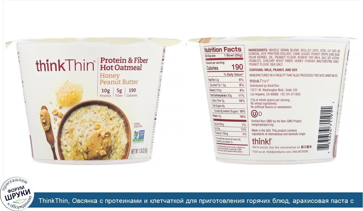 ru ThinkThin, Овсянка с протеинами и клетчаткой для приготовления горячих блюд, арахисовая паста с медом, 50г (1,76унции)
