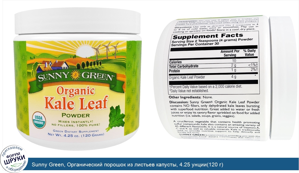 Друзья, если у вас есть отзыв/дополнение/комментарий/вопрос относительно Sunny Green, Органический порошок из листьев капусты, 4.25 унции(120 г) - напишите его ответом в эту тему (это будет полезно всему сообществу в целом и вам в отдельности).