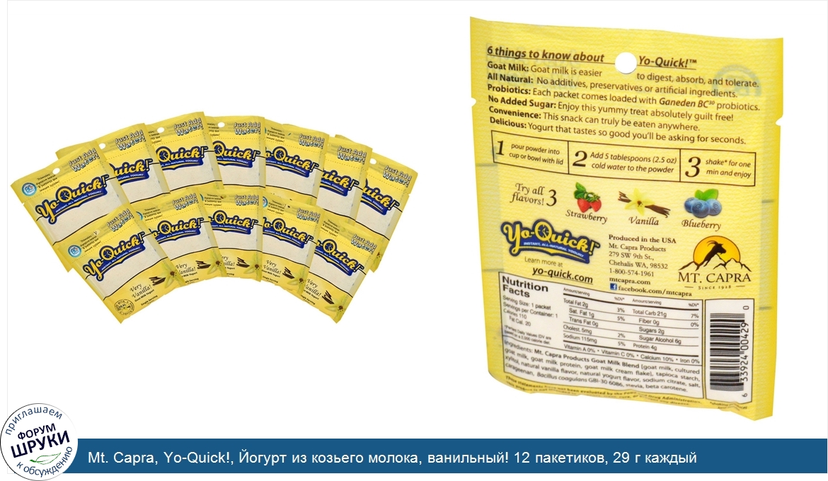 Друзья, если у вас есть отзыв/дополнение/комментарий/вопрос относительно Mt. Capra, Yo-Quick!, Йогурт из козьего молока, ванильный! 12 пакетиков, 29 г каждый - напишите его ответом в эту тему (это будет полезно всему сообществу в целом и вам в отдельности).