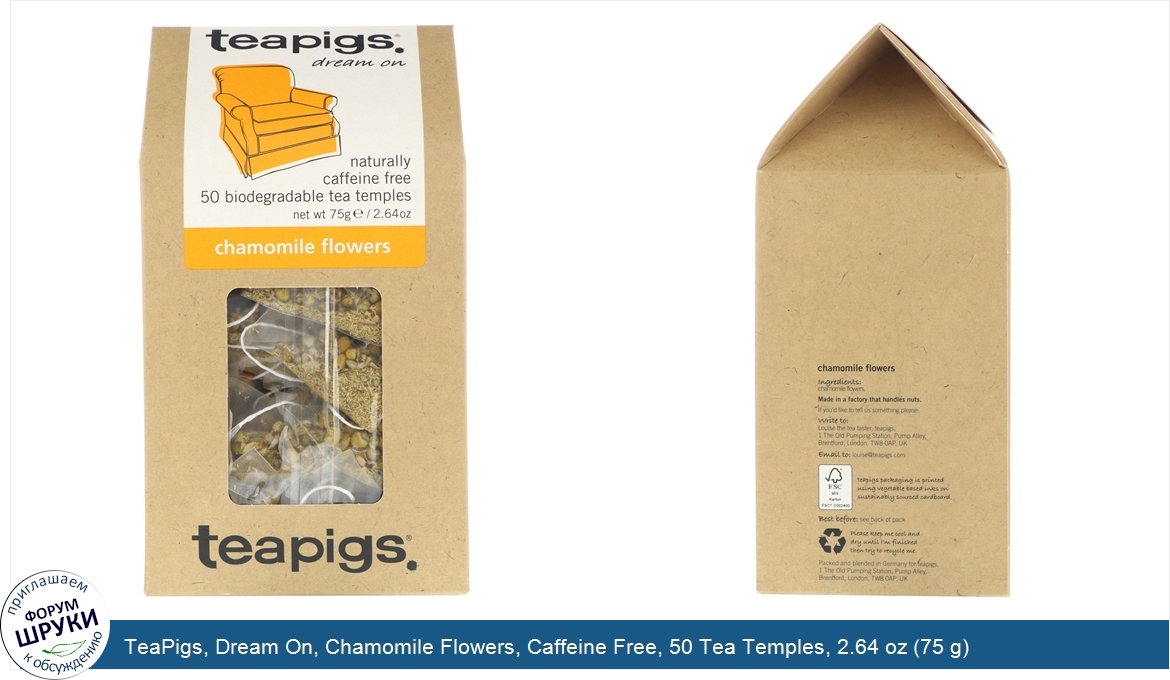 Друзья, если у вас есть отзыв/дополнение/комментарий/вопрос относительно TeaPigs, Dream On, Chamomile Flowers, Caffeine Free, 50 Tea Temples, 2.64 oz (75 g) - напишите его ответом в эту тему (это будет полезно всему сообществу в целом и вам в отдельности).