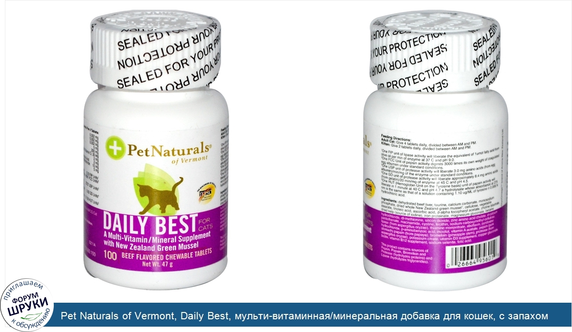 Друзья, если у вас есть отзыв/дополнение/комментарий/вопрос относительно Pet Naturals of Vermont, Daily Best, мульти-витаминная/минеральная добавка для кошек, с запахом говядины, 100 жевательных таблеток - напишите его ответом в эту тему (это будет полезно всему сообществу в целом и вам в отдельности).