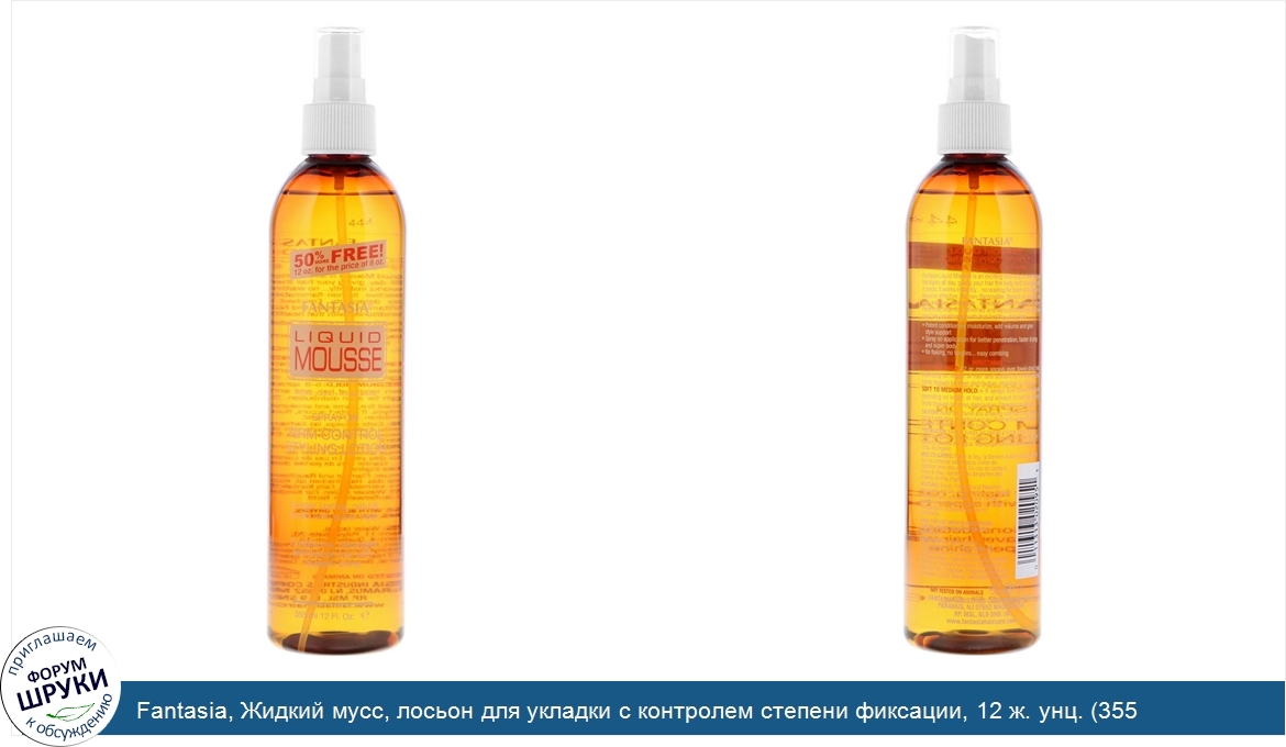 Друзья, если у вас есть отзыв/дополнение/комментарий/вопрос относительно Fantasia, Жидкий мусс, лосьон для укладки с контролем степени фиксации, 12 ж. унц. (355 мл) - напишите его ответом в эту тему (это будет полезно всему сообществу в целом и вам в отдельности).