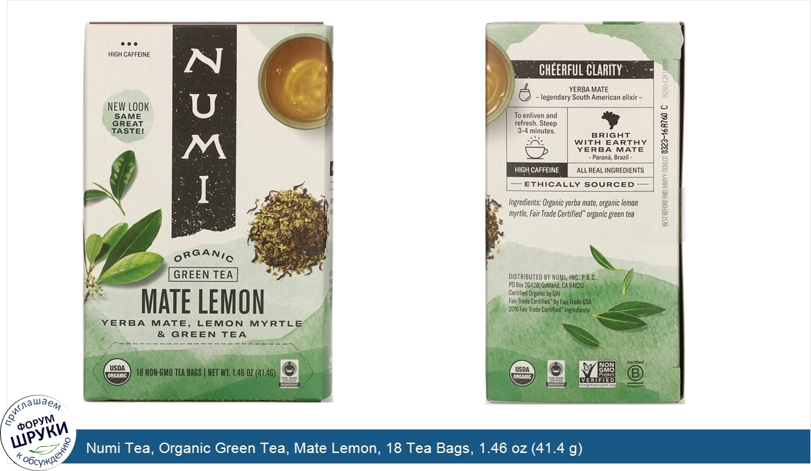 [DESCRIPT]Activating Purpose. High Caffeine. Great Taste! Yerba Mate, Lemon Myrtle Green Tea. USDA Organic. 18 Non-GMO Tea Bags. All Real Ingredients. Ethically Sourced. Certified Organic by QAI. Fair Trade Certified™ by Fair Trade USA. 20% Fair Trade Certified™ Ingredients. Non GMO Project Verified. Certified B Corporation. Plant Based Tea Wrapper. Halal. Kosher. Open to Activate. Activate Your Senses. Activate Your Purpose. Activate Real Change. Cheerful Clarity. Yerba Mate - legendary South American elixir -. Bright with Earthy Yerba Mate. - Parana, Brazil-. Keeping It Real. We are a sister and brother who believe in taking care of our global family and this planet we live on. That's why we source the purest tea leaves, herbs and flowers straight from nature, no compromise. Numi is a unique blend of art and alchemy, tradition and vision, and transformation and healing. We've committed to the well-being of the world.[/DESCRIPT]... (описание дополняется)