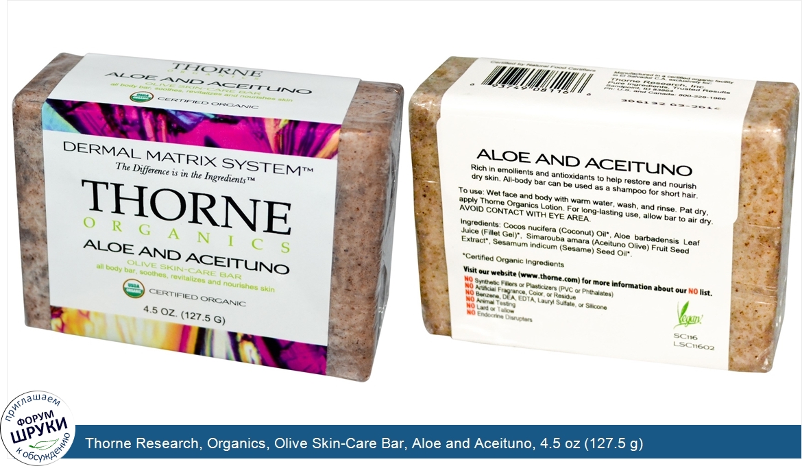 ru Thorne Research, Organics, Olive Skin-Care Bar, Aloe and Aceituno, 4.5 oz (127.5 g)
