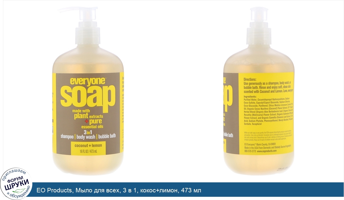Друзья, если у вас есть отзыв/дополнение/комментарий/вопрос относительно EO Products, Мыло для всех, 3 в 1, кокос+лимон, 473 мл - напишите его ответом в эту тему (это будет полезно всему сообществу в целом и вам в отдельности).