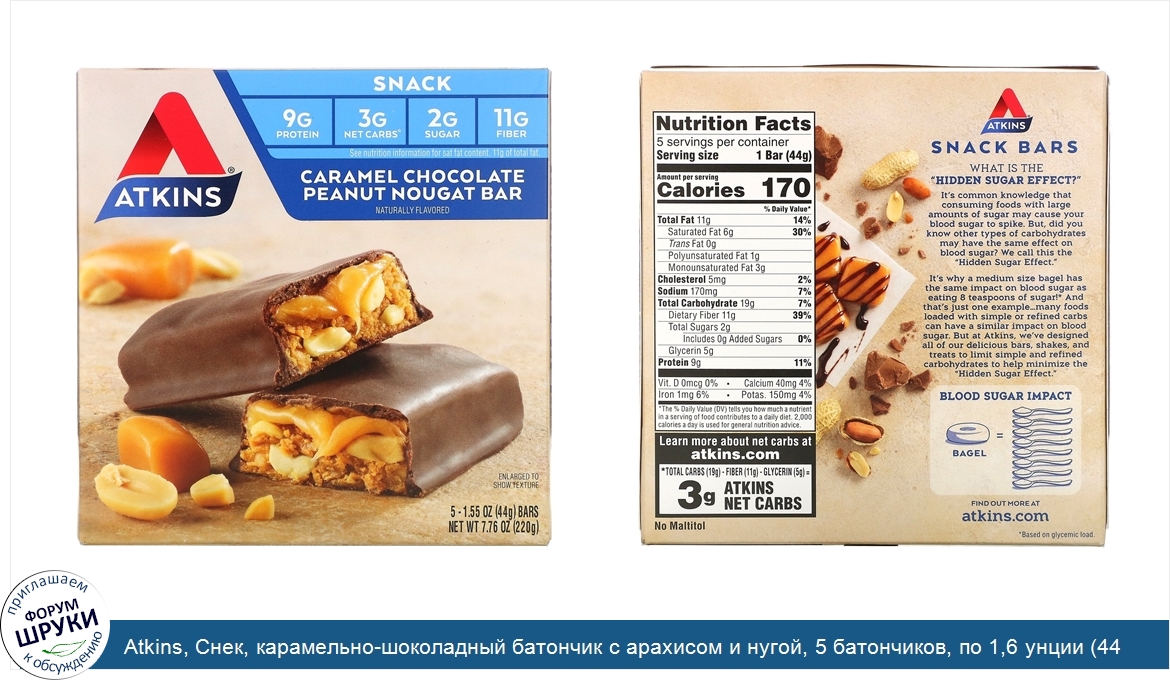 Друзья, если у вас есть отзыв/дополнение/комментарий/вопрос относительно Atkins, Снек, карамельно-шоколадный батончик с арахисом и нугой, 5 батончиков, по 1,6 унции (44 г) каждый - напишите его ответом в эту тему (это будет полезно всему сообществу в целом и вам в отдельности).
