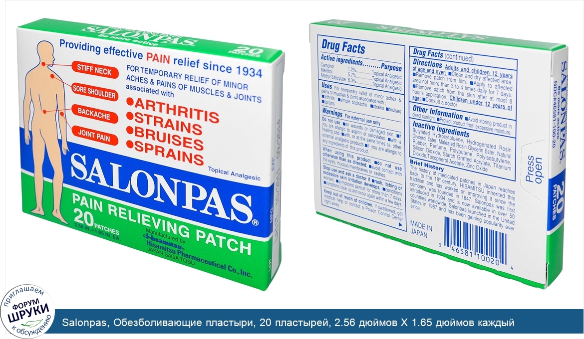 Друзья, если у вас есть отзыв/дополнение/комментарий/вопрос относительно Salonpas, Обезболивающие пластыри, 20 пластырей, 2.56 дюймов X 1.65 дюймов каждый - напишите его ответом в эту тему (это будет полезно всему сообществу в целом и вам в отдельности).
