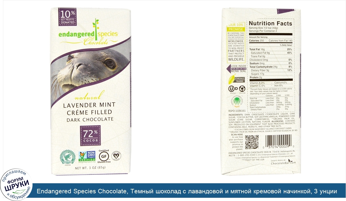 Друзья, если у вас есть отзыв/дополнение/комментарий/вопрос относительно Endangered Species Chocolate, Темный шоколад с лавандовой и мятной кремовой начинкой, 3 унции (85 г) - напишите его ответом в эту тему (это будет полезно всему сообществу в целом и вам в отдельности).