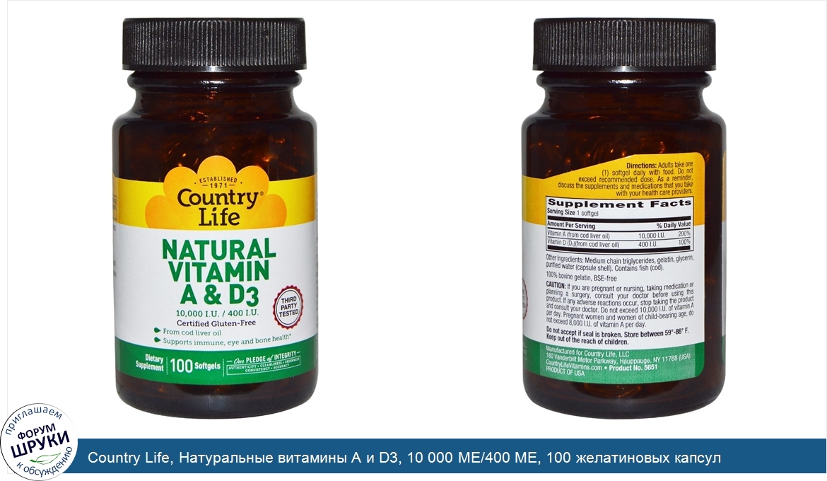 Country Life, Натуральные витамины A и D3, 10 000 МЕ/400 МЕ, 100 желатиновых капсул