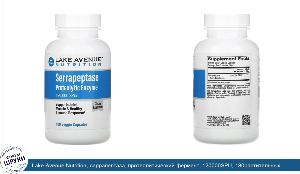 Друзья, если у вас есть отзыв/дополнение/комментарий/вопрос относительно Lake Avenue Nutrition, серрапептаза, протеолитический фермент, 120000SPU, 180растительных капсул - напишите его ответом в эту тему (это будет полезно всему сообществу в целом и вам в отдельности).