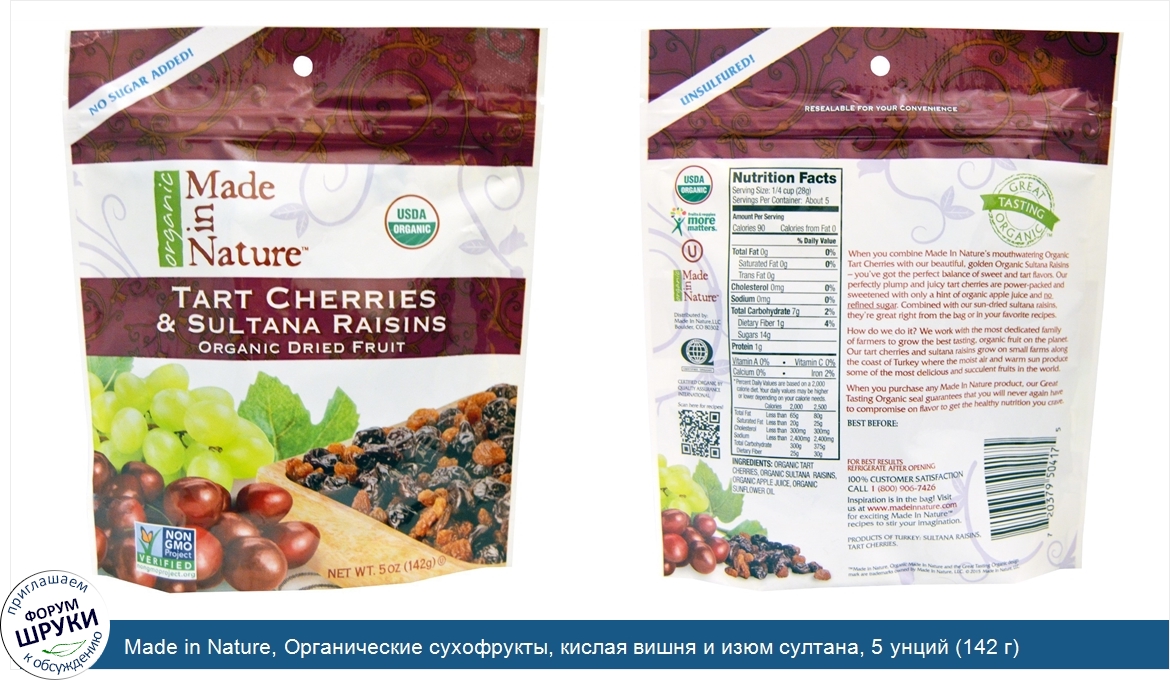 Друзья, если у вас есть отзыв/дополнение/комментарий/вопрос относительно Made in Nature, Органические сухофрукты, кислая вишня и изюм султана, 5 унций (142 г) - напишите его ответом в эту тему (это будет полезно всему сообществу в целом и вам в отдельности).