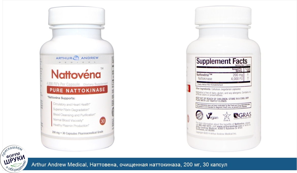 ru Arthur Andrew Medical, Наттовена, очищенная наттокиназа, 200 мг, 30 капсул