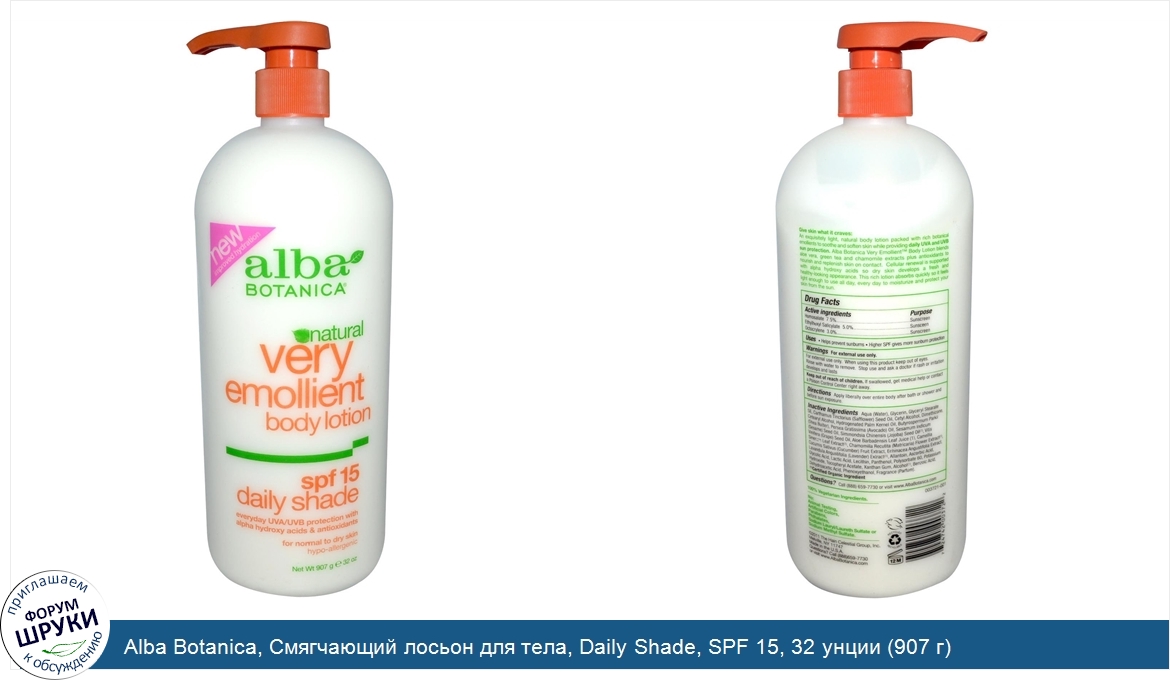 Друзья, если у вас есть отзыв/дополнение/комментарий/вопрос относительно Alba Botanica, Смягчающий лосьон для тела, Daily Shade, SPF 15, 32 унции (907 г) - напишите его ответом в эту тему (это будет полезно всему сообществу в целом и вам в отдельности).