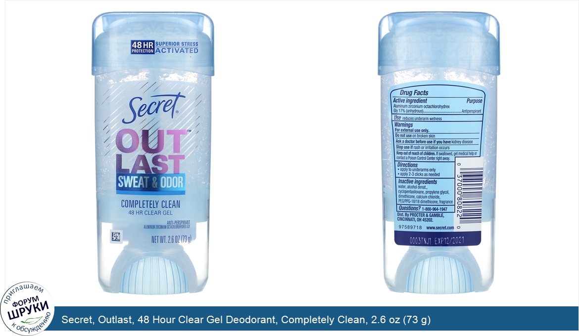 Друзья, если у вас есть отзыв/дополнение/комментарий/вопрос относительно Secret, Outlast, 48 Hour Clear Gel Deodorant, Completely Clean, 2.6 oz (73 g) - напишите его ответом в эту тему (это будет полезно всему сообществу в целом и вам в отдельности).