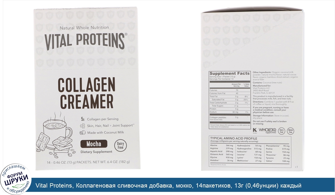 Друзья, если у вас есть отзыв/дополнение/комментарий/вопрос относительно Vital Proteins, Коллагеновая сливочная добавка, мокко, 14пакетиков, 13г (0,46унции) каждый - напишите его ответом в эту тему (это будет полезно всему сообществу в целом и вам в отдельности).