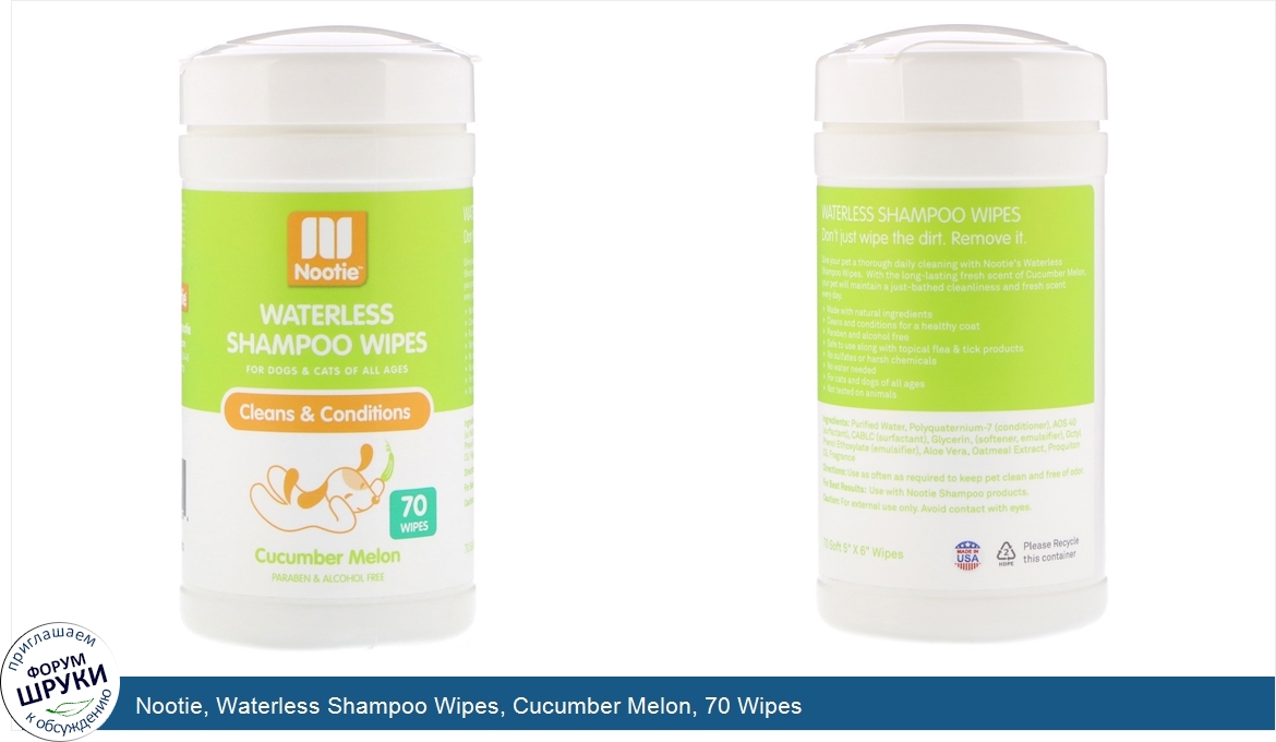 [DESCRIPT]For Dogs Cats of All Ages. Cleans Conditions. Paraben Alcohol Free. Waterless Shampoo Wipes. Don't just wipe the dirt. Remove it. Give your pet a throughout daily cleaning with Nootie's Waterless Shampoo Wipes. With the long-lasting fresh scent of Cucumber Melon, your pet will maintain a just-bathed cleanliness and fresh scent every day. Made with natural ingredients. Cleans and conditions for a healthy coat. Paraben and alcohol free. Safe to use along with topical flea tick products. No sulfates or harsh chemicals. No water needed. For cats and dogs of all ages. Not tested on animals.[/DESCRIPT]... (описание дополняется)