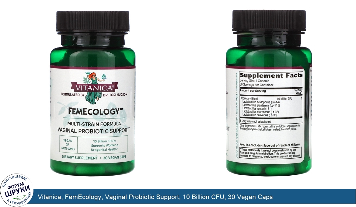 10 Bil/Cap Now With Reuteri. Vaginal/Intestinal Probiotic. Formulated by Dr. Tori Hudson. Dietary Supplement. Formulated by Dr. Tori Hudson, a Naturopathic Physician specializing in women's natural health. FemEco...