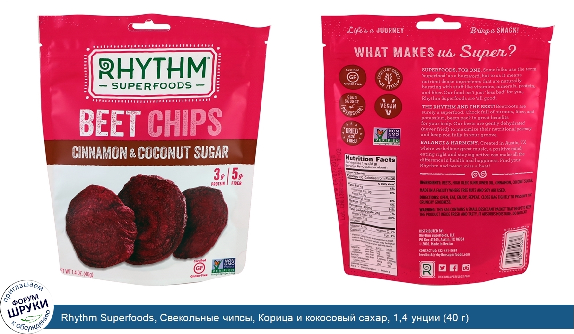 [DESCRIPT]3 g Protein | 5 g Fiber. Certified Gluten-Free. Non-GMO Project Verified. Life's a Journey. Bring a Snack! . Good Source of Potassium. Dried Not Fried. Excellent Source of Fiber. Vegan. What Makes Us Super? Superfoods, For One. Some folks use the term 'superfood' as a buzzword, but to us it means nutrient dense ingredients that are naturally bursting with stuff like vitamins, minerals, protein, and fiber. Our food isn't just 'less bad' for you. Rhythm Superfoods are 'all good'. The Rhythm and The Beet! Beetroots are surely a superfood. Chock full of nitrates, fiber, and potassium, beets pack in great benefits for your body. Our beets are gently dehydrated (never fried) to maximize their nutritional potency and keep you fully in your groove. Balance Harmony. Created in Austin, TX where we believe great music, a positive mind, eating right and staying active can make all the difference in health and happiness. Find your Rhythm and never miss a beat![/DESCRIPT]... (описание дополняется)