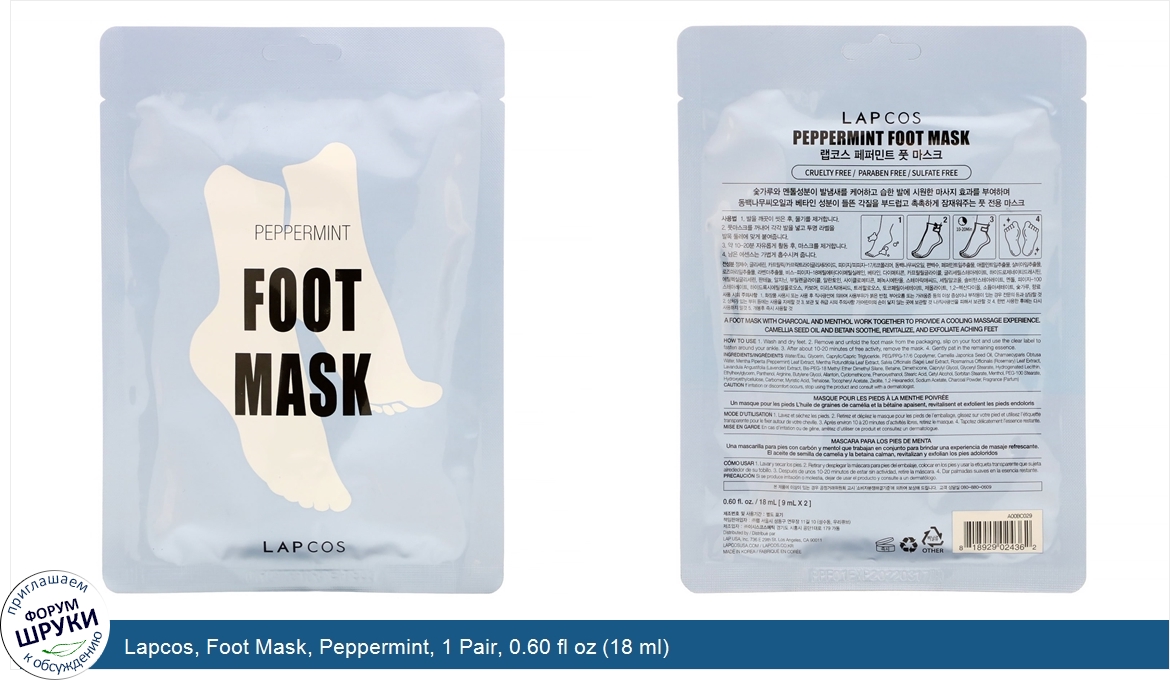Друзья, если у вас есть отзыв/дополнение/комментарий/вопрос относительно Lapcos, Foot Mask, Peppermint, 1 Pair, 0.60 fl oz (18 ml) - напишите его ответом в эту тему (это будет полезно всему сообществу в целом и вам в отдельности).