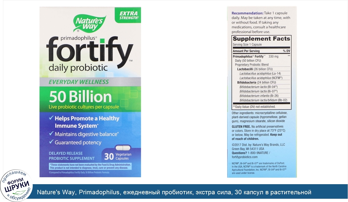 [DESCRIPT]Vitamin Aisle. Extra Strength†. Everyday Wellness. 50 Billion - Live Probiotic Cultures per Capsule. Helps Promote a Healthy Immune System. Maintains Digestive Balance. Guaranteed Potency. Delayed Release Probiotic Supplement. 50 Billion Active Cultures. Formulated with a balanced ratio of Lactobacilli and Bifidobacteria probiotics, Primadophilus Fortify is a powerful ally for supporting daily immune health and digestive balance. 26 billion Lactobacilli to work in your small intestine. 24 billion Bifidobacteria to support your colon. Everyday Wellness. To get the most out of this unique formula, make it part of your daily wellness routine. Taking Primadophilus Fortify every day helps:. Promote immune health. Support overall digestive balance. Prevent occasional gas/bloating/constipation. Delayed Release. Primadophilus Fortify capsules resist stomach acid better than standard capsules to help deliver probiotics to the intestine. Extra Strength† 50 Billion. While many probiotic brands only provide 1 to 10 billion live cultures per serving, Primadophilus Fortify Extra Strength† are powerful formulas with 50 billion live probiotic cultures per capsule to help balance and replenish your intestinal tract. Researched Strains. Primadophilus Fortify daily contains researched probiotics including NCFM, Bi-07 and Bl-04. Guaranteed Potency. The 50 billion potency of this product is guaranteed until expiration when stored under recommended conditions. Potency of live cultures measured in Colony Forming Units (CFU). †Compared to Primadophilus Fortify 30 Billion Probiotic Formula.[/DESCRIPT]... (описание дополняется)