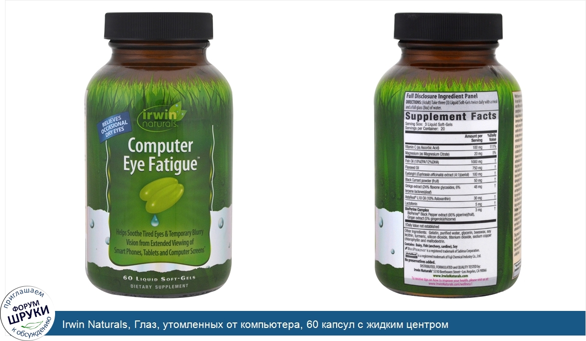 [DESCRIPT]Relieves Occasional Dry Eyes. Dietary Supplement. Helps soothe tired eyes temporary blurry vision from extended viewing of smart phones, tablets and computer screens. With the ever-increasing of visual displays in our daily lives - from the computer screens in our offices and homes to televisions, tablets, and smartphones -we subject our eyes to more taxing visual stimulus than ever before. This is why we developed Computer Eye Fatigue, an advanced mutli-pronged formula specially-formulated to help soothe tired eyes and temporary blurry vision, and to help relieve occasional dry eyes caused by the extended viewing of these various visual stimuli. At the heart of our formula is AstaReal Astaxanthin, a naturally occurring carotenoid that has been show in recent studies to display enormous antioxidant activity. Astaxanthin is the red pigment that gives salmon, crabs and even flamingos their vivid reddish coloration and helps protect them from harmful environmental conditions and cell damaging free radicals. Astaxanthin also supports ocular blood flow. Our formula feature Lactoferrin, an important protein that has beneficial properties for eye health. In addition, this product includes Fish Oil which supplies supportive EPA and DHA to help combat occasional dry eyes. Computer Eye Fatigue contains antioxidant rich Vitamin C and delivers a range of botanicals such as Eyebright and Gingko leaf extract, traditionally used to support eye health, and Black Currant for additional antioxidant support. This product can be taken daily to support overall health and well-being of your eyes, or as needed to help soothe tired eyes and temporary blurry vision from the extended viewing of various screens on a daily basis. What makes us different:. Liquid Soft-Gels -. The nutrients in the easy-to-swallow Liquid Soft Gels are released fast. Other forms of delivery can obtain binder and fillers that may cause stomach upset and offer no nutritional value. Advanced Liquid Soft-Gels provide an optimum delivery system. Quality Assurance -. Irwins Naturals is committed to providing the highest quality products for your health. We employ compliance testing to ensure purity and potency. Patented BioPerine. - BioPerine enhances the bioavailability, absorption and potency of many nutrients.[/DESCRIPT]... (описание дополняется)