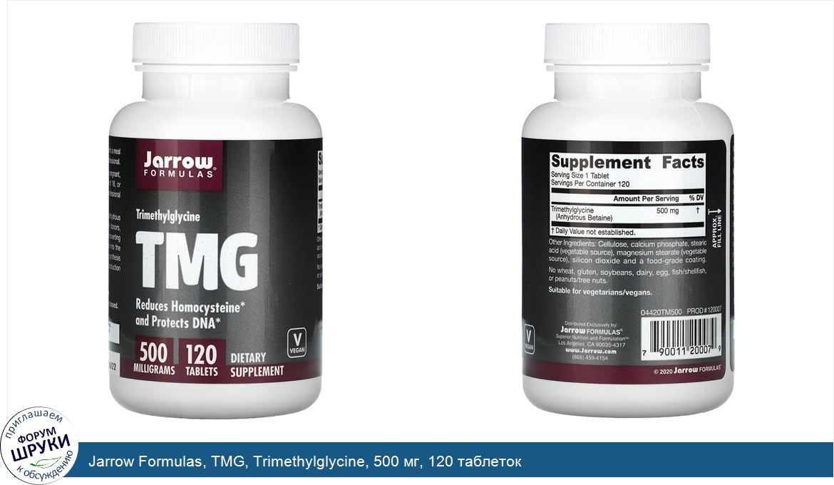 Jarrow Formulas, TMG, Trimethylglycine, 500 мг, 120 таблеток