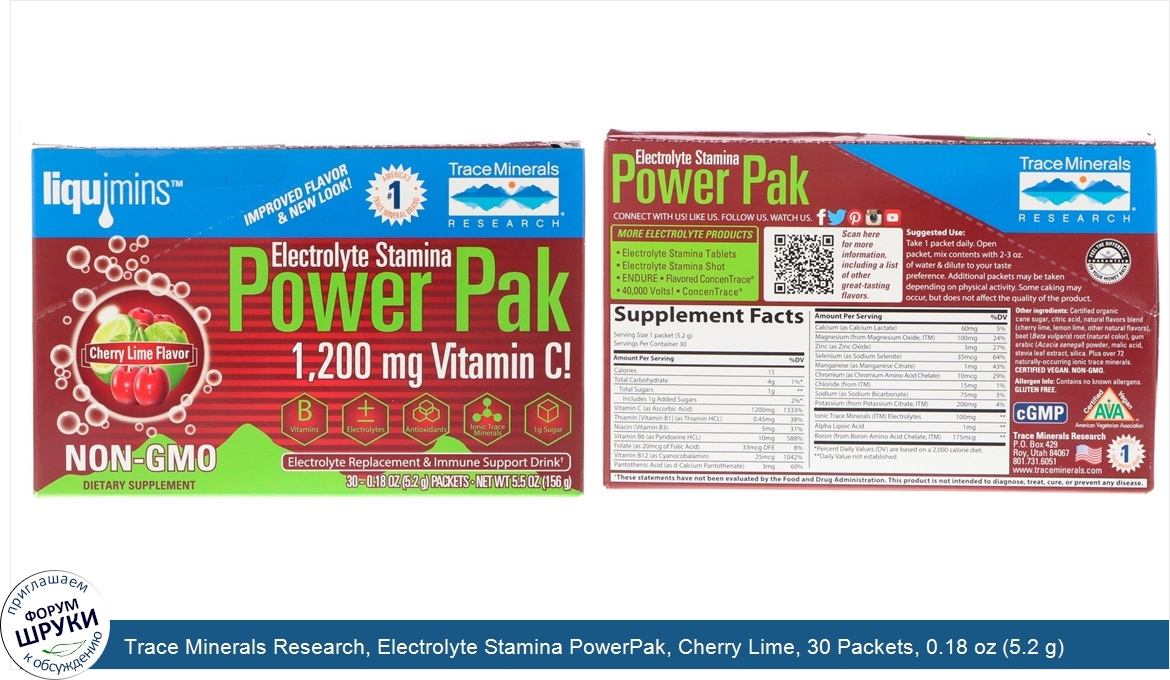 [DESCRIPT]America's #1 Trace Mineral Brand. Non-GMO. Dietary Supplement. 1,200 mg Vitamin C! . B Vitamins. + / - Electrolytes. Antioxidants. Ionic Trace Minerals. 1 g Sugar. Liquimins. Electrolyte Replacement Immune Support Drink. Play Harder, Endure Longer. cGMP. Certified Vegan -AVA. Gluten Free. A flavored effervescent "fizzing" drink with vitamins and over 72 electrolytes. When should I take a Power Pak? . Before, during, and after your workout to help maintain healthy hydration levels and avoid muscle cramps. After a hot day in the sun. Every day to maintain energy, vitality, and a healthy immune system. To avoid occasional sluggishness fatigue. Why is Power Pak better? . Non-GMO formula, only 1 g sugar, 200 mg more vitamin C than the leading brand. No caffeine, artificial flavors, or artificial stimulants. Essential electrolytes: Sodium, potassium, calcium, magnesium, plus over 72 electrolytes from ionic trace minerals.[/DESCRIPT]... (описание дополняется)