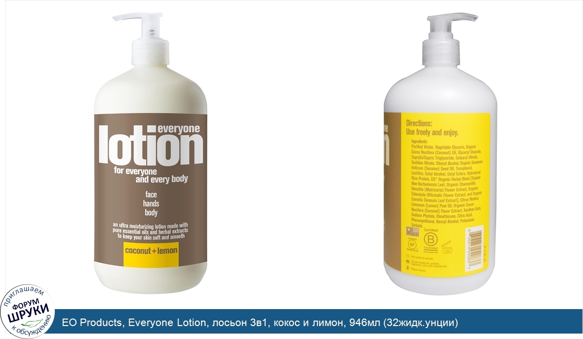 Друзья, если у вас есть отзыв/дополнение/комментарий/вопрос относительно EO Products, Everyone Lotion, лосьон 3в1, кокос и лимон, 946мл (32жидк.унции) - напишите его ответом в эту тему (это будет полезно всему сообществу в целом и вам в отдельности).