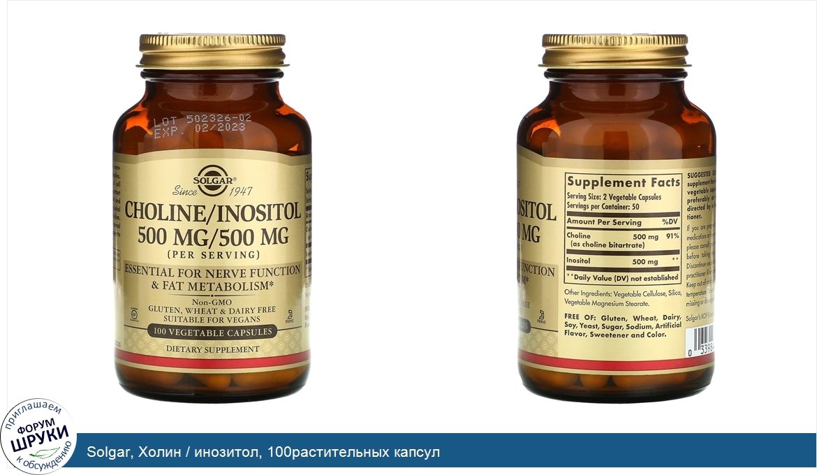 С 1947 года. 500 мг/500 мг (в каждой порции). Необходимы для здоровья мозга и нервной системы. Без клейковины, пшеницы и молочных продуктов. Подходит для вегетарианцев. Пищевая добавка. Кошер парве. Холин и инози...