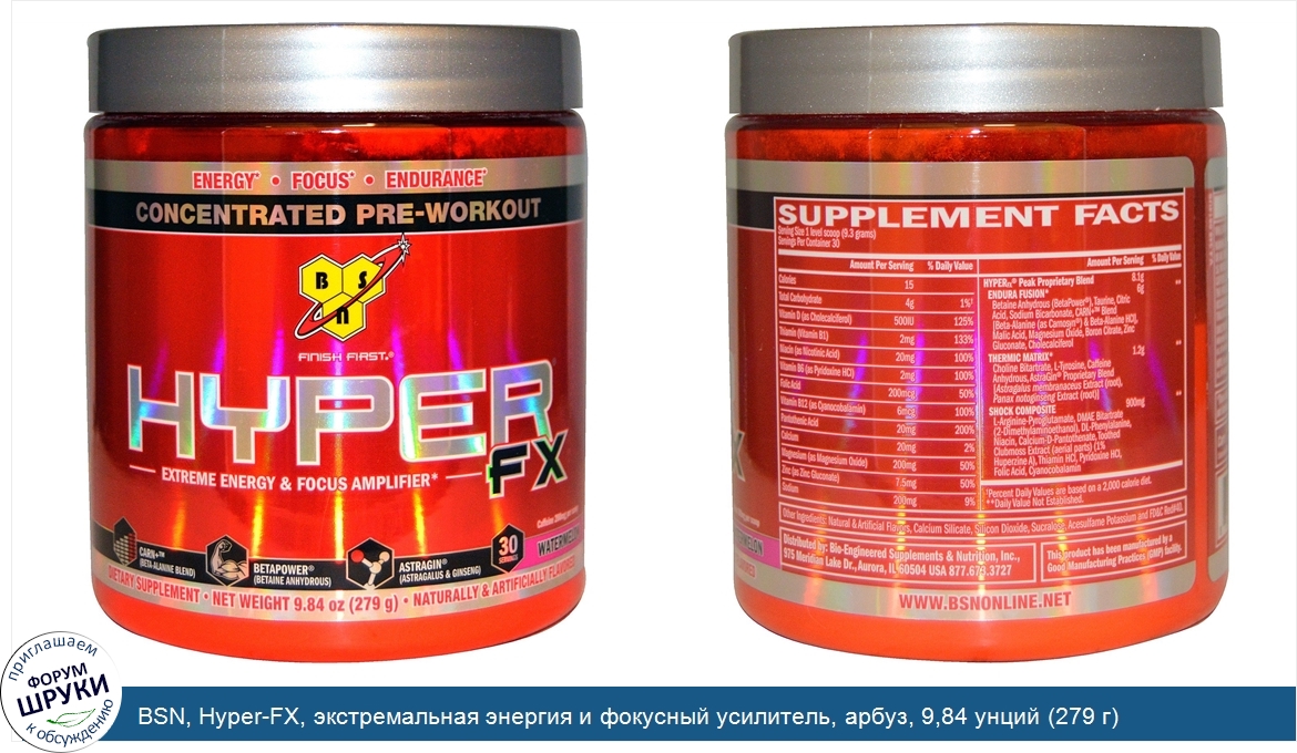 Друзья, если у вас есть отзыв/дополнение/комментарий/вопрос относительно BSN, Hyper-FX, экстремальная энергия и фокусный усилитель, арбуз, 9,84 унций (279 г) - напишите его ответом в эту тему (это будет полезно всему сообществу в целом и вам в отдельности).