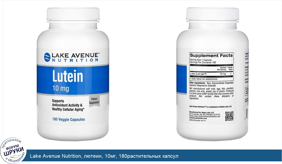ru Lake Avenue Nutrition, лютеин, 10мг, 180растительных капсул