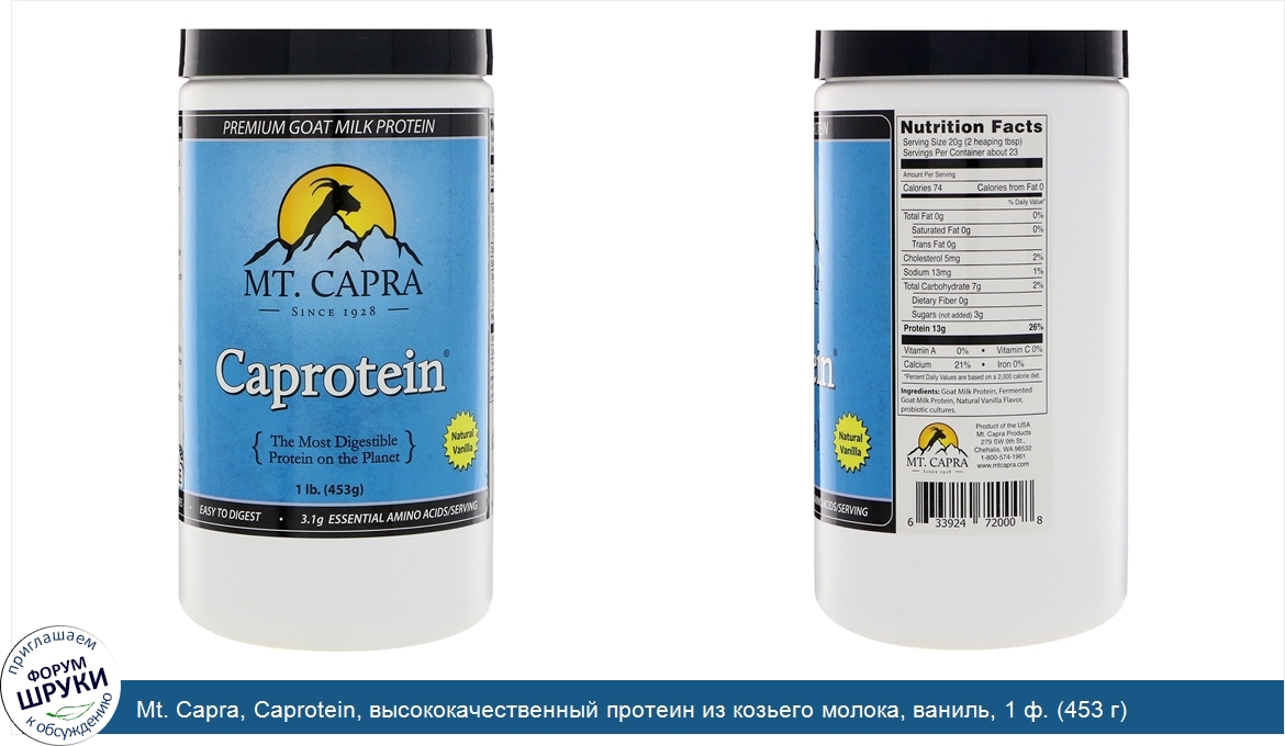 Друзья, если у вас есть отзыв/дополнение/комментарий/вопрос относительно Mt. Capra, Caprotein, высококачественный протеин из козьего молока, ваниль, 1 ф. (453 г) - напишите его ответом в эту тему (это будет полезно всему сообществу в целом и вам в отдельности).