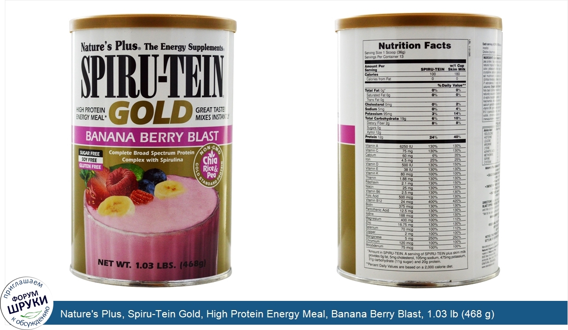 Друзья, если у вас есть отзыв/дополнение/комментарий/вопрос относительно Nature's Plus, Spiru-Tein Gold, High Protein Energy Meal, Banana Berry Blast, 1.03 lb (468 g) - напишите его ответом в эту тему (это будет полезно всему сообществу в целом и вам в отдельности).