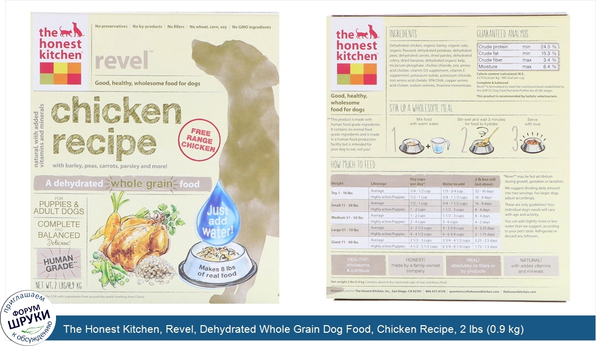 [DESCRIPT]No Preservatives. No By-Products. No Fillers. No Wheat, Corn, Soy. No GMO Ingredients. Good Healthy, Wholesome Food for Dogs. Natural, with Added Vitamins and Minerals. With Barely, Peas, Carrots, Parsley and More! With Free Range Chicken. A Dehydrated Whole Grain Food. For Puppies Adult Dogs. Complete and Balanced. Delicious! Human Grade**. Made in the USA with Ingredients from Around the World (Nothing from China). Just Add Water! All This Goodness. 3 of Free Range Chicken Pounds. 1 1/2 Scoops of Barely. Squeezed Into One 2 LB Box. 2 3/4 Carrots. 2 3/4 Celery Stalks. 1 Cup of Fresh Peas. 1 1/2 Bunch of Parsley. <. This Product is Recommended by Holistic Veterinarians. Estimates based on some of our fresh ingredients, before dehydration. ** This product is made with human food grade ingredients. It contains no animal feed grade ingredients and is made in a human food production facility but is intended for your dog to eat, not you! We Think Pets Deserve Proper Food! The Honest Kitchen is a way to feed your pet real, human grade wholesome food. Our food is gently dehydrated, so it's natural and a healthy, less processed alternative to many commercial foods - but still safe! Healthy! Wholesome Nutritious. Honest! Made by a family-owned company. Real! Absolutely no fillers or by-products. Natural! With added vitamins and minerals. Complete balanced. Revel™ is formulated to meet the nutritional levels established by the AAFCO Dog Food Nutrient Profiles for all life stages.[/DESCRIPT]... (описание дополняется)