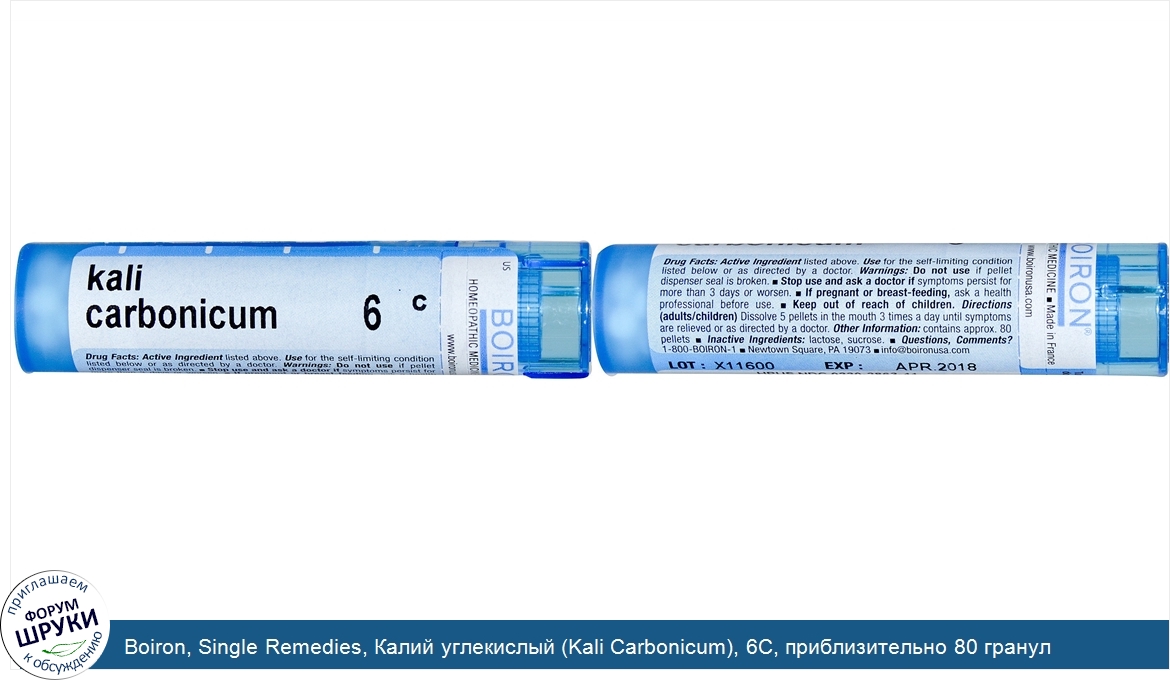 Друзья, если у вас есть отзыв/дополнение/комментарий/вопрос относительно Boiron, Single Remedies, Калий углекислый (Kali Carbonicum), 6C, приблизительно 80 гранул - напишите его ответом в эту тему (это будет полезно всему сообществу в целом и вам в отдельности).