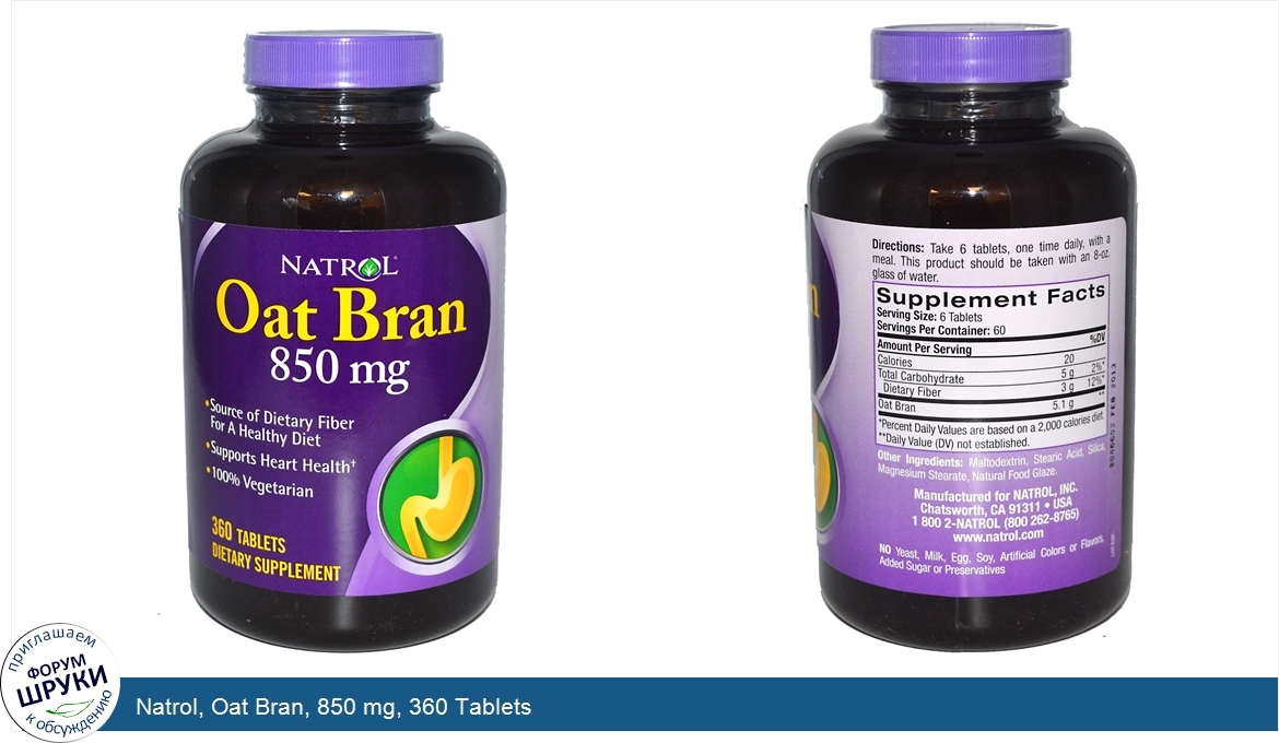 [DESCRIPT]Source of Dietary Fiber For a Healthy Diet. Supports Heart Health. 100% Vegetarian. Dietary Supplement. Natrol Oat Bran tablets are a convenient way to get the dietary fiber necessary for a healthy diet. Oat bran is a good source of dietary fiber, including soluble fiber. An adequate intake of soluble fiber supports heart health, but may be missing from many diets. Eating foods high in both soluble and insoluble fiber may support heart health.[/DESCRIPT]... (описание дополняется)