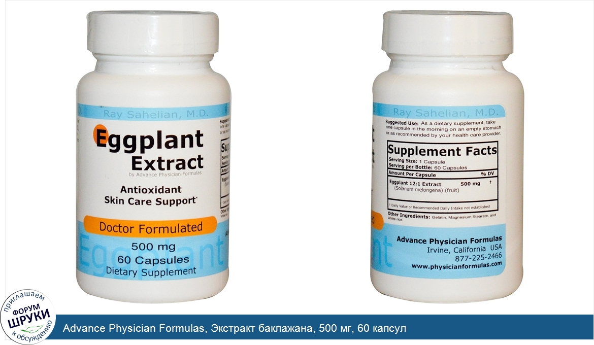 Друзья, если у вас есть отзыв/дополнение/комментарий/вопрос относительно Advance Physician Formulas, Экстракт баклажана, 500 мг, 60 капсул - напишите его ответом в эту тему (это будет полезно всему сообществу в целом и вам в отдельности).