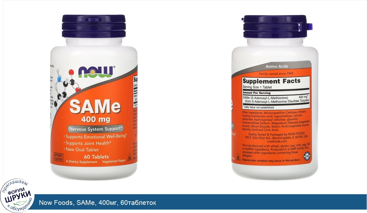 Друзья, если у вас есть отзыв/дополнение/комментарий/вопрос относительно Now Foods, SAMe, 400мг, 60таблеток - напишите его ответом в эту тему (это будет полезно всему сообществу в целом и вам в отдельности).